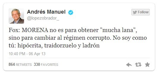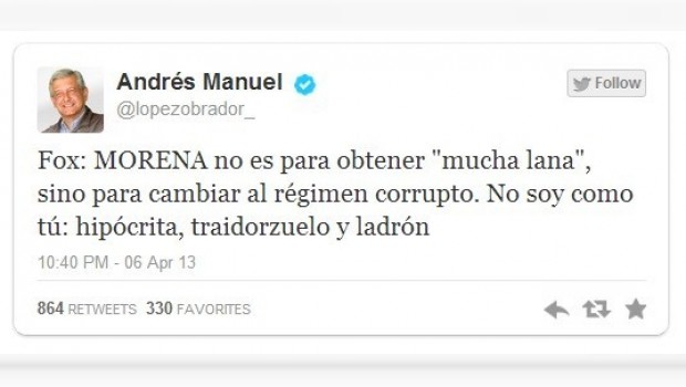 "Fox: MORENA no es para obtener "mucha lana", sino para cambiar al régimen corrupto. No soy como tú: hipócrita, traidorzuelo y ladrón", escribió el tabasqueño en su perfil @lopezobrador_.