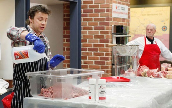 Jamie Oliver durante su programa demostrando como se lava la carne de desecho con amoniaco para ser reutilizada.