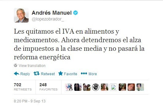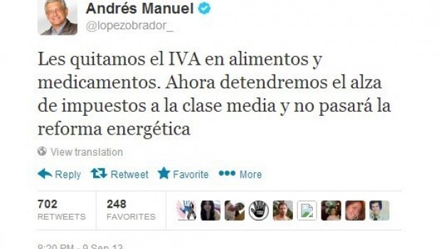 A través de su cuenta de Twitter el ex candidato presidencial indicó que el movimiento que encabeza (Morena) detendrá el alza de impuestos a la clase media, contenidos en la iniciativa federal.