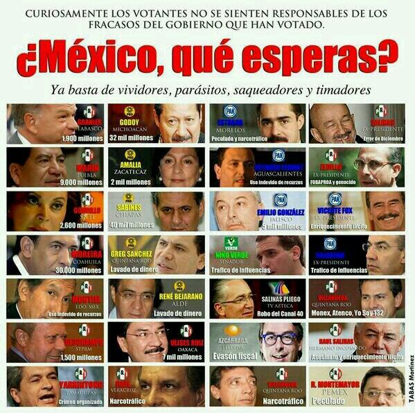 MEXICANOS AL GRITO DE YA NO VOTO POR POLITIQUILLOS RATEROS DEL PATRIMONIO, HAMBREADORES Y EMPOBRECEDORES DE MEXICANOS. CON MAS DE 30 AÑOS PEGADOS A LA UBRE QUE NO QUIEREN SOLTAR!! AL DIABLO CON ELLOS!!