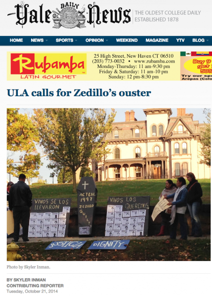 En el marco del llamado a la solidaridad por la presentación con vida de los 43 estudiantes de Ayotzinapa, desaparecidos en Iguala desde el 26 de septiembre, un grupo de al menos 30 personas protestaron en la Universidad de Yale.