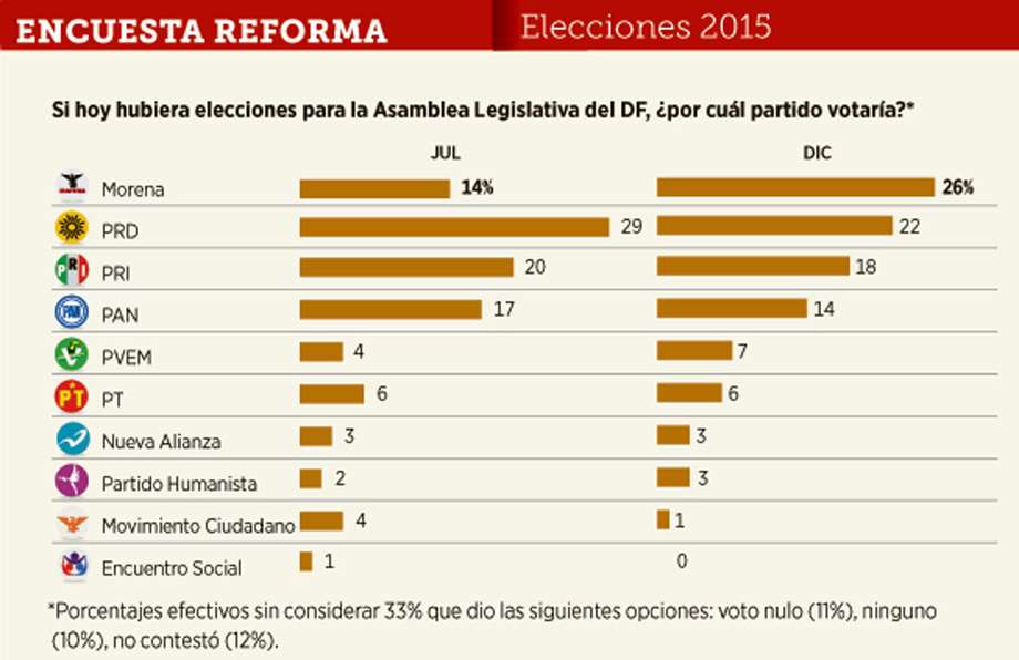 Con menos de seis meses de su reconocimiento oficial, a partir del 9 de julio de 2014, el Movimiento Regeneración Nacional (Morena), se convirtió en uno de los principales contendientes rumbo a las elecciones de 2015 en el Distrito Federal y en la última encuesta del diario Reforma, el partido político encabeza las preferencias para elegir a los integrantes de la Asamblea Legislativa del DF.