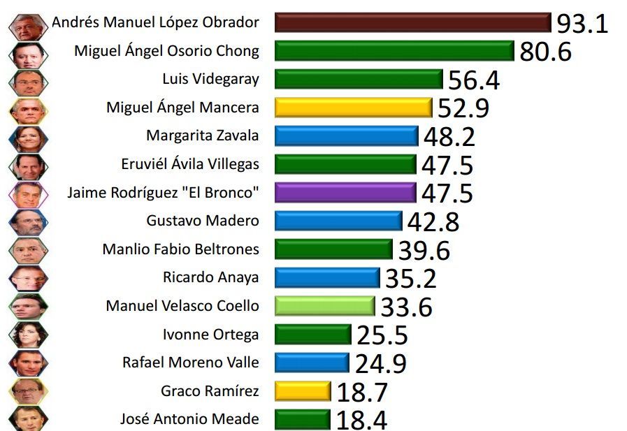 La encuesta de la reconocida casa encuestadora también confirmó que Andrés Manuel López Obrador se coloca como el político con el mayor índice de reconocimiento en el país, ya que 9 de cada 10 mexicanos conoce al líder moral de Morena y dos veces candidato a la presidencia de la República.