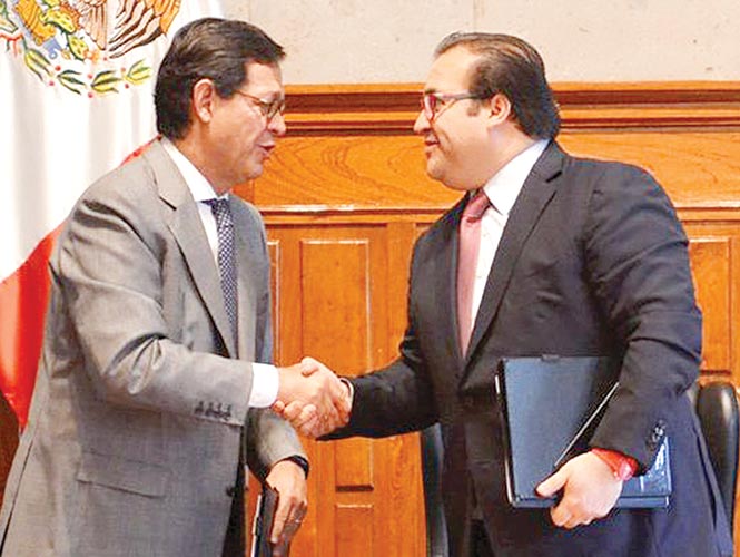El subsecretario de la Segob, Roberto Campa Cifrián, y el gobernador de Veracruz, Javier Duarte, durante la firma del convenio. Foto: Tomada de la cuenta de Twitter @GobiernoVer
