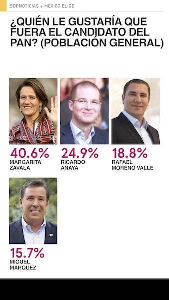 Margarita Zavala es la aspirante del PAN más competitiva electoralmente pues es quien tiene menor diferencia porcentual con López Obrador; le siguen Ricardo Anaya y Rafael Moreno Valle, éste último mejorando su competitividad respecto el mes anterior.