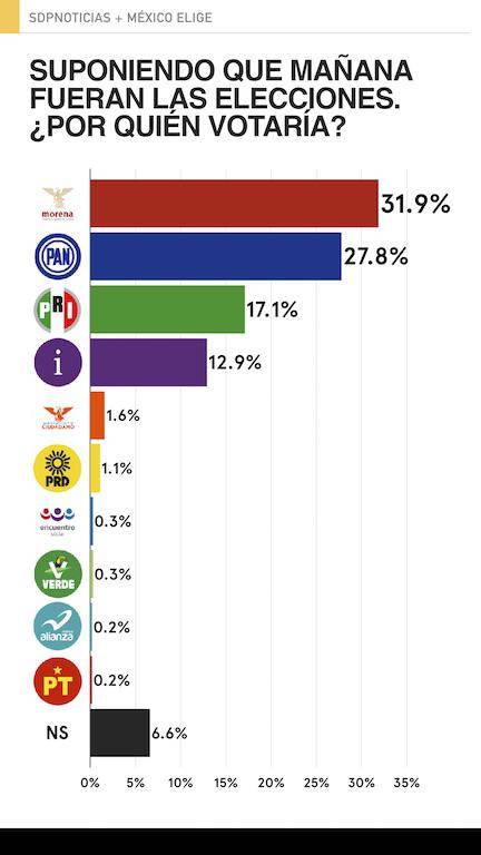 Al preguntar intención de voto por partido prácticamente no hay cambio alguno. MORENA en primer lugar con el 33.2%, el PAN en un cercano segundo lugar con 28.9. El PRI en la tercera posición, seguido de los independientes.