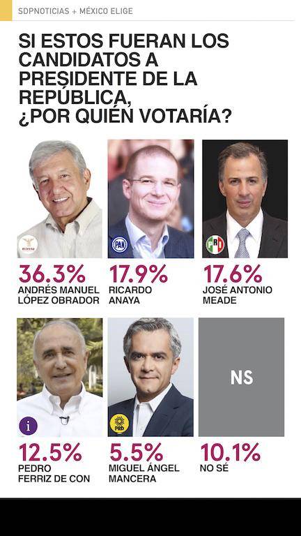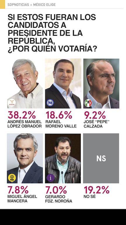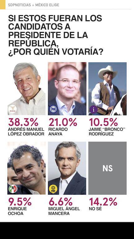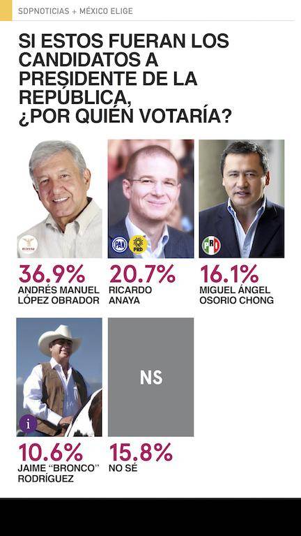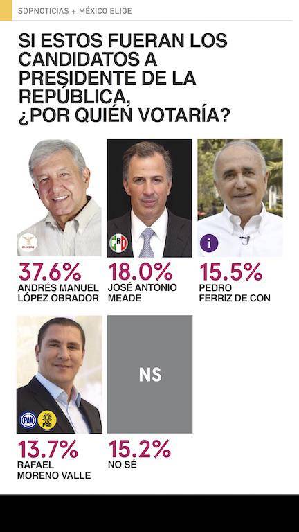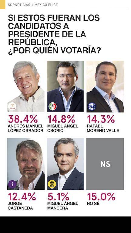 Por el lado de los independientes es Ferriz de Con a quien le va mejor en los posibles escenarios, sus niveles de intención de voto van del 8.1% hasta el 16.1%. Le siguen de cerca Castañeda y Rodríguez. Noroña no es el independiente más competitivo pero es el único que reducen el margen de ventaja de López Obrador.