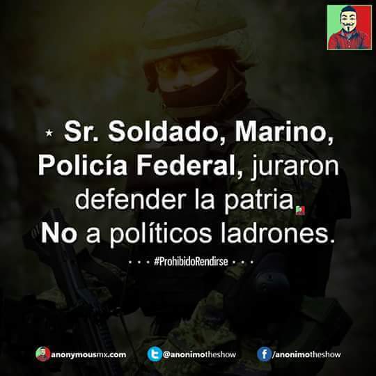 Claudia @Claudia_ag 4 hhace 4 horas Más Al soldado, Marino, Policía Federal: juraron Defender a la Patria No al político corrupto❗ No lo olviden❗ pic.twitter.com/TwwIHZXPa8