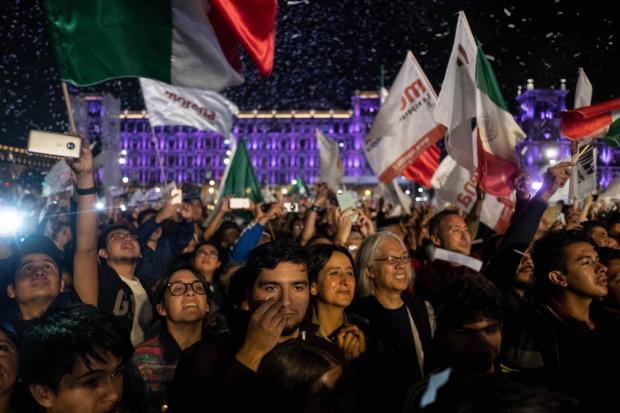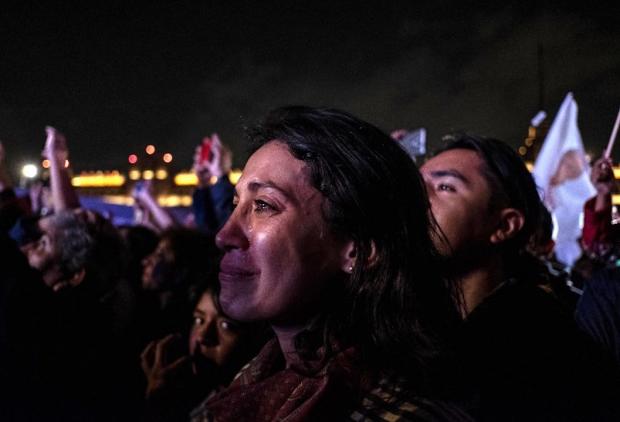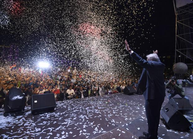 “Sin incidentes que lamentar”, reporta un policía en la esquina de 5 de Mayo y Plaza de la Constitución. Destaca que los simpatizantes de López Obrador han sido ejemplares. Por lo menos hasta las 12:00 horas en que Andrés aparece en el escenario extendiendo los brazos y respirando profundo. “Amor con amor se paga”, les dice para atizar la algarabía que no es poca.