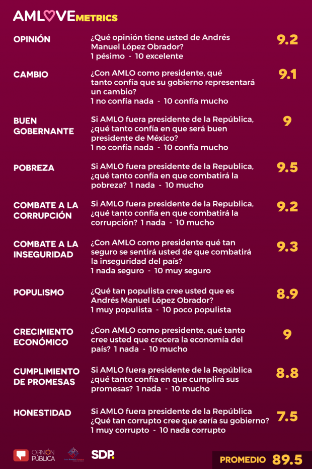 Te escribo hoy para mencionarte el AMLOVEmetrics, que dos empresas consultoras hicieron este domingo para SDP Noticias, Opinión Pública Marketing e Imagen, de Desiderio Morales, y Social Research Solutions, de Verónica Malo Guzmán, Fernanda Díez-Torres y Ricardo Pedraza.