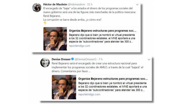 El día de ayer, tanto la columnista de Reforma, Denise Dresser, como el columnista de El Universal, Héctor de Mauleón (a quién sus seguidores en redes sociales llaman con cariño ´Tío Lucas´) difundieron entre sus decenas de miles de seguidores una “nota” del portal Reporte Índigo, titulada “Organiza Bejarano estructuras para programas sociales”.