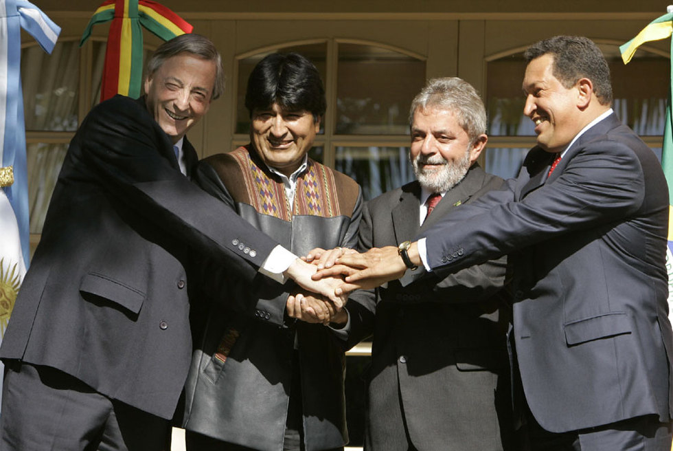 Néstor Kirchner (izquierda), Evo Morales, Luiz Inácio Lula da Silva y Hugo Chávez